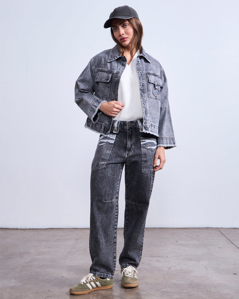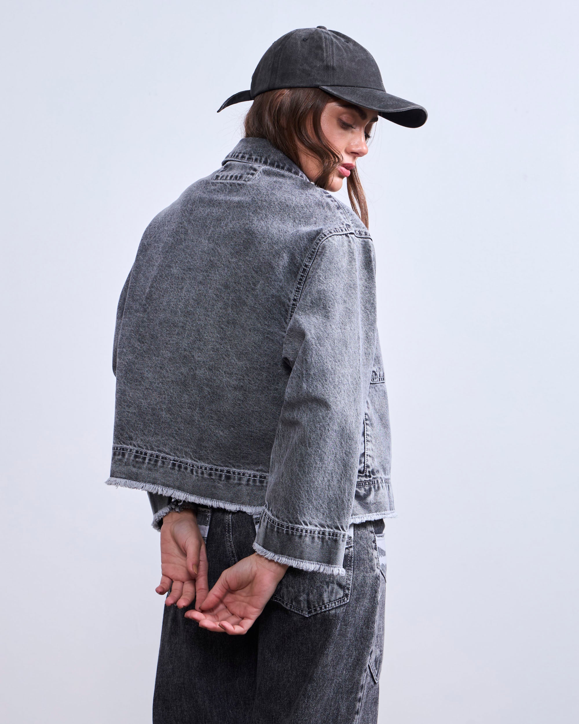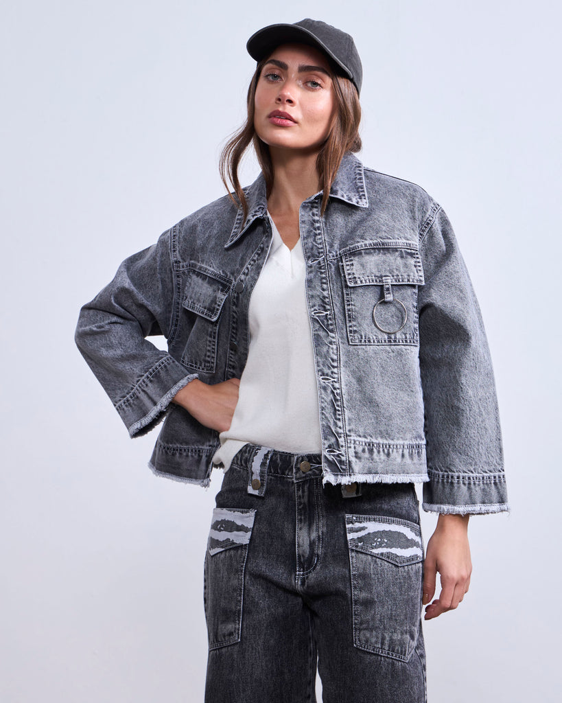 Chaqueta liviana con cuello solapa y manga larga acabada en puño. Bolsillos en delantero. Cierre frontal con botones metálicos. Detalle de argolla metálica en uno de los bolsillos.