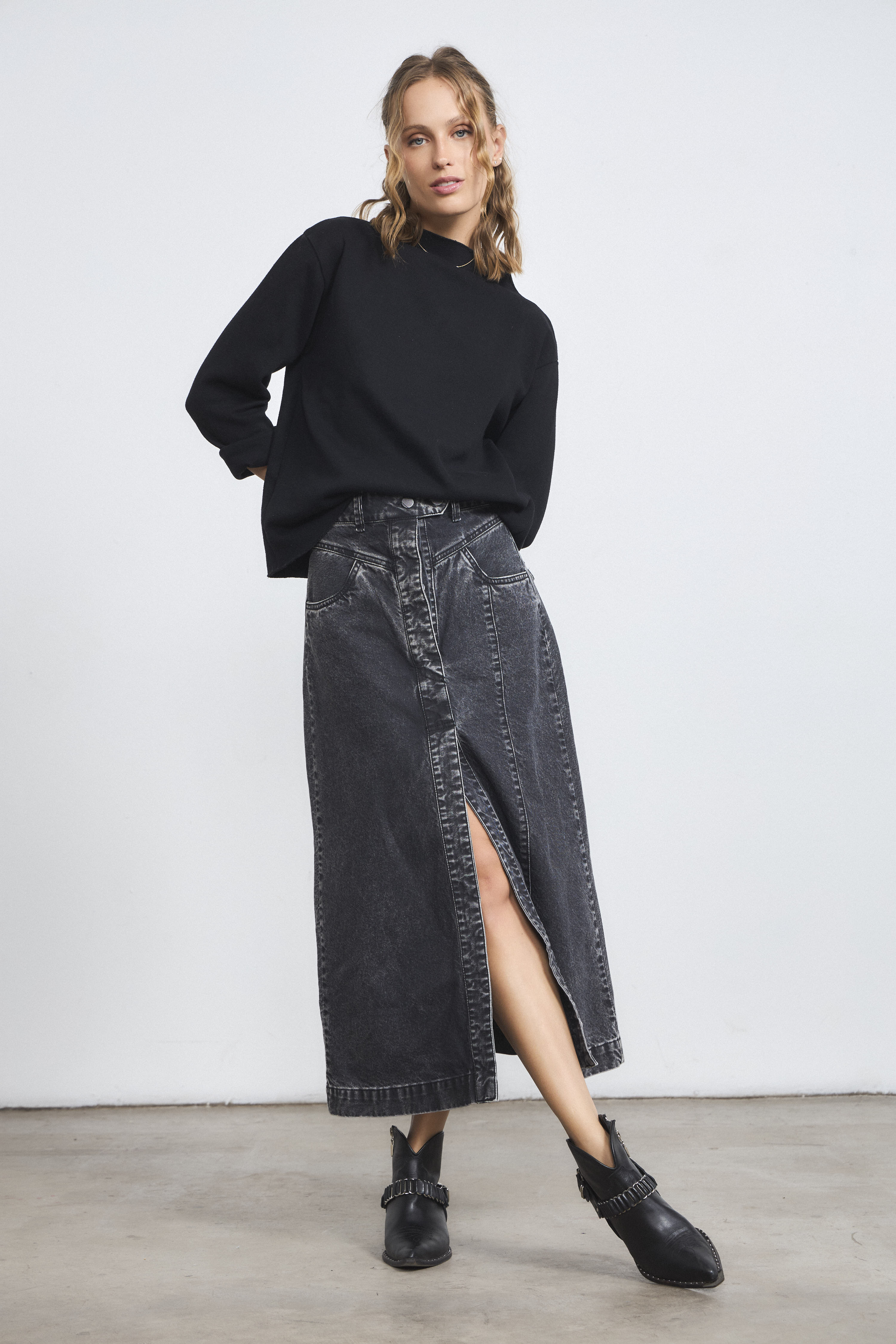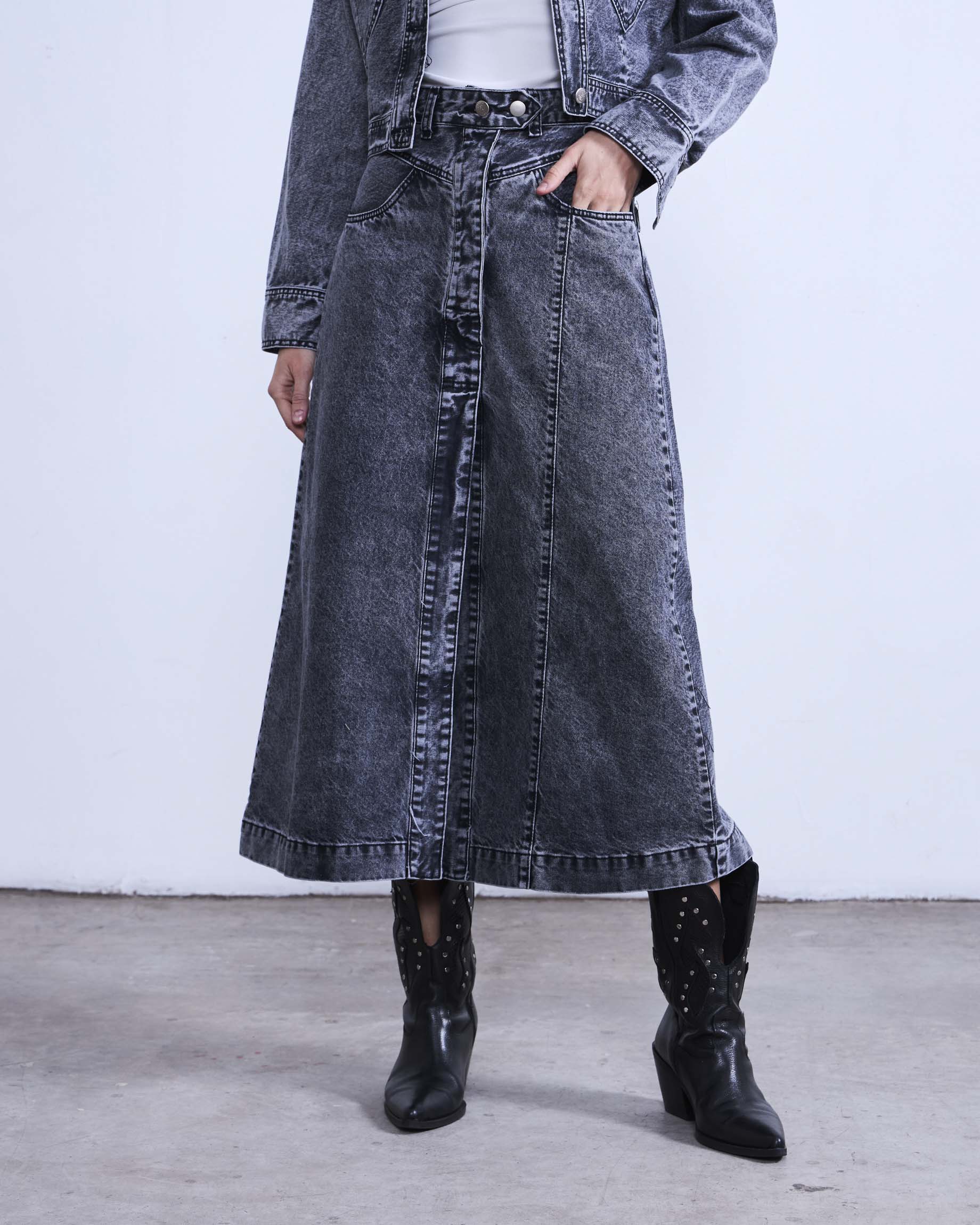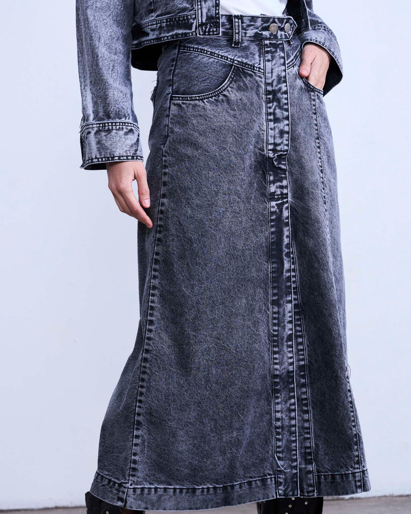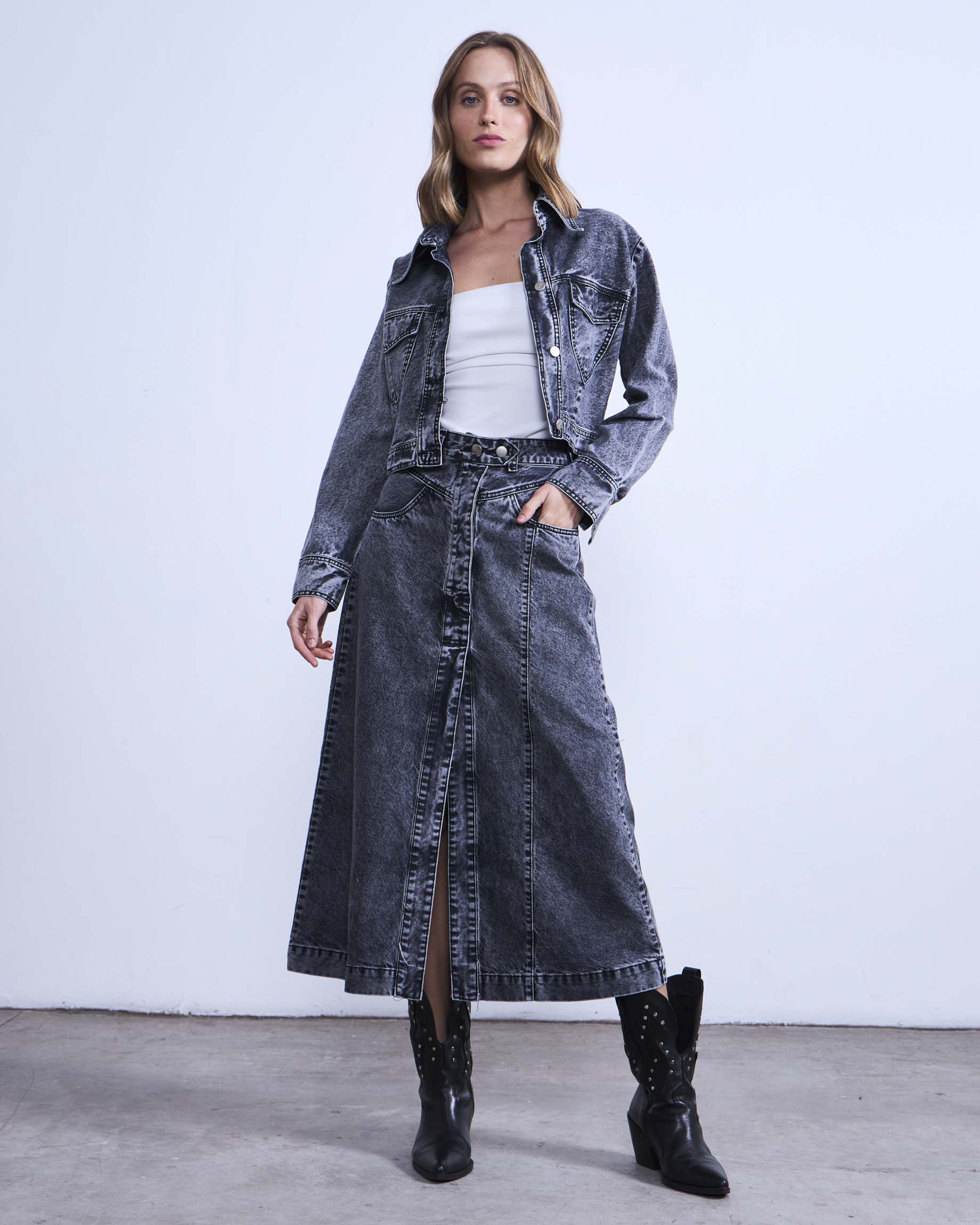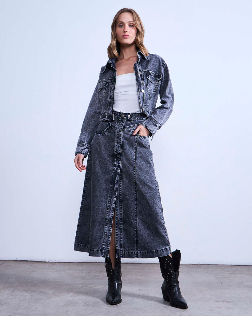La falda denim que combina estilo y actitud. Con calce recto y largo midi, esta prenda destaca por su diseño en denim gris lavado y su confección estructurada que realza la figura manteniendo comodidad.