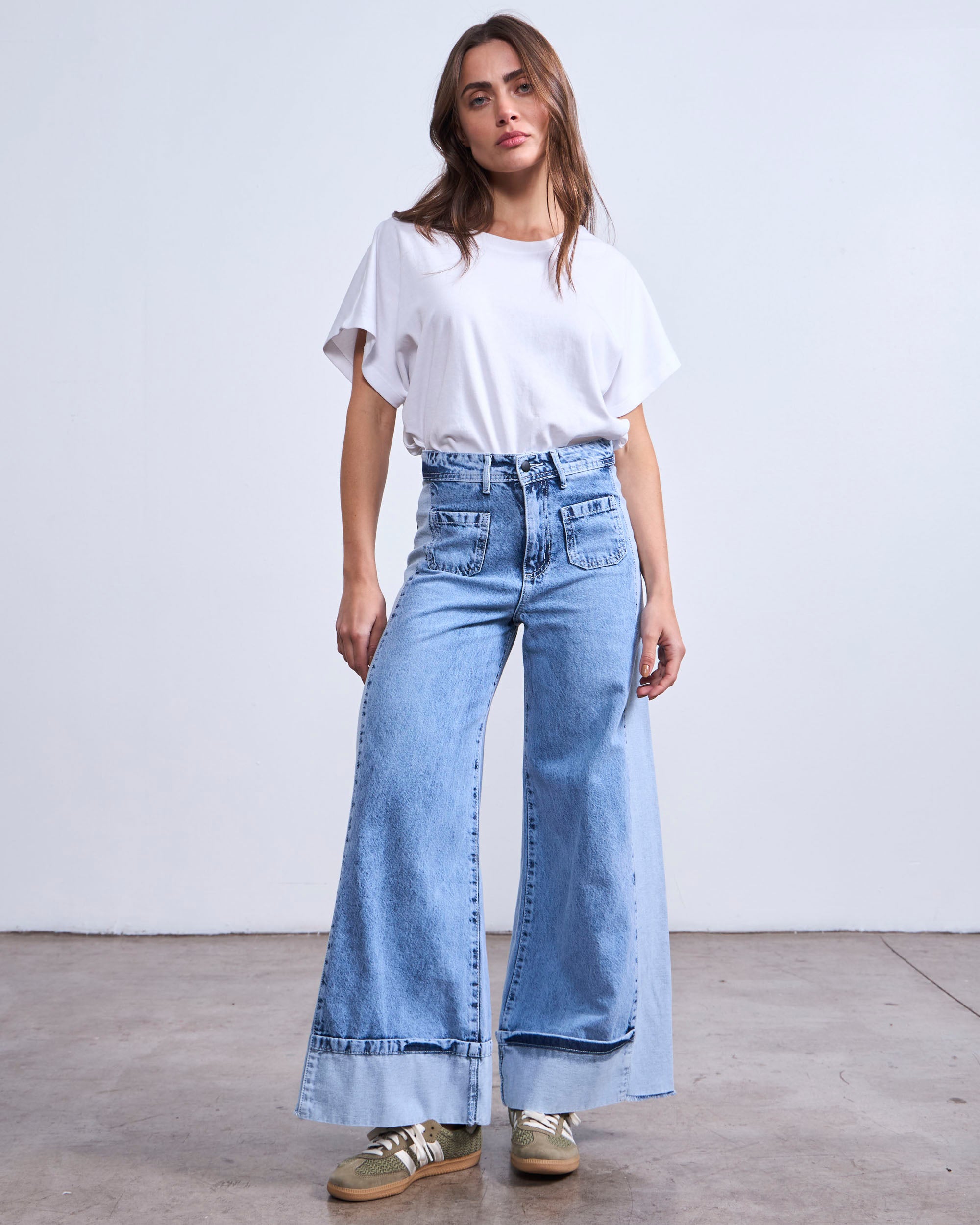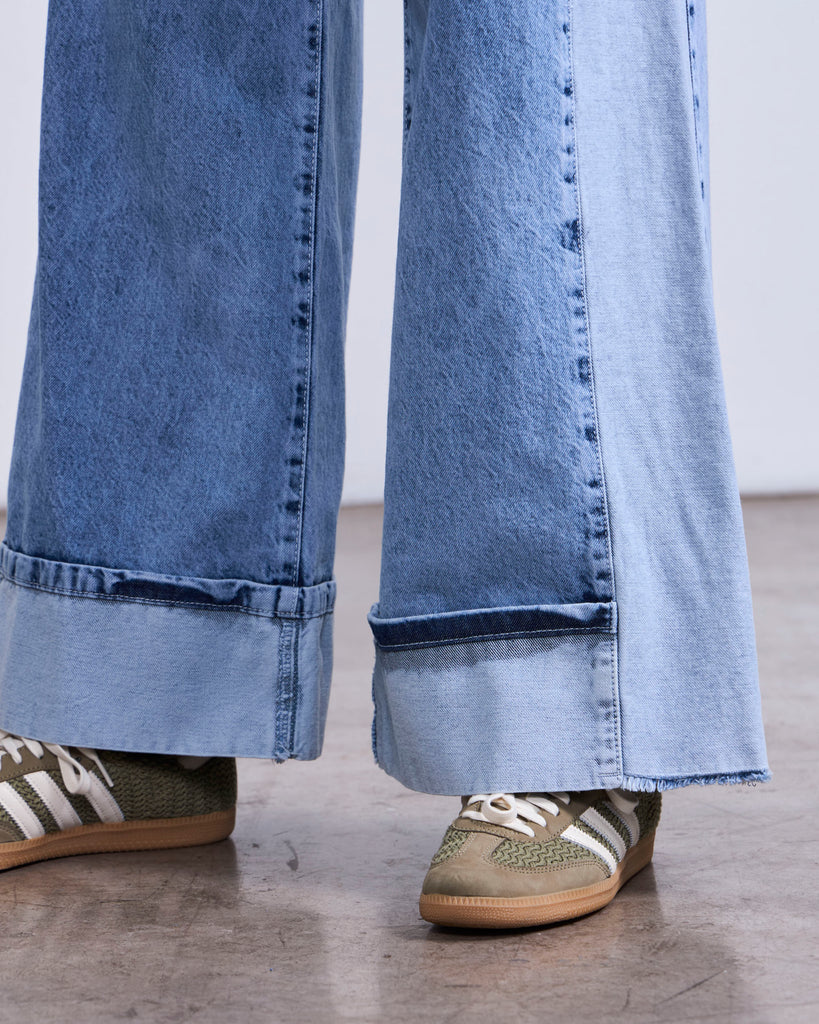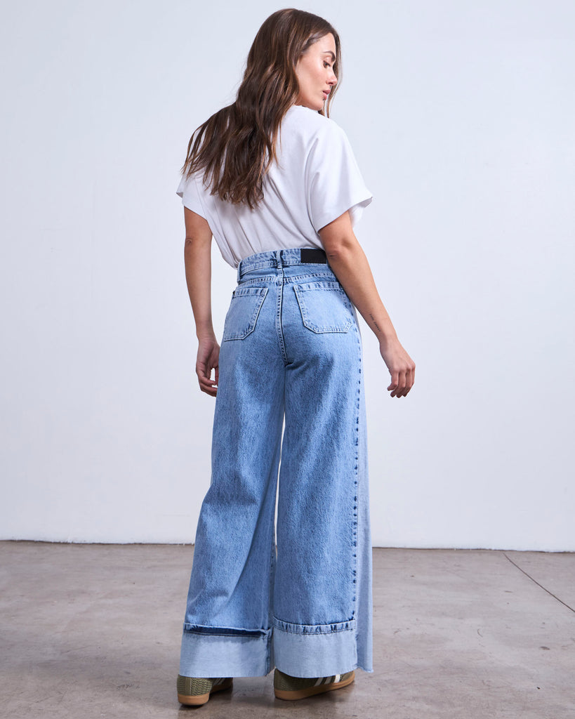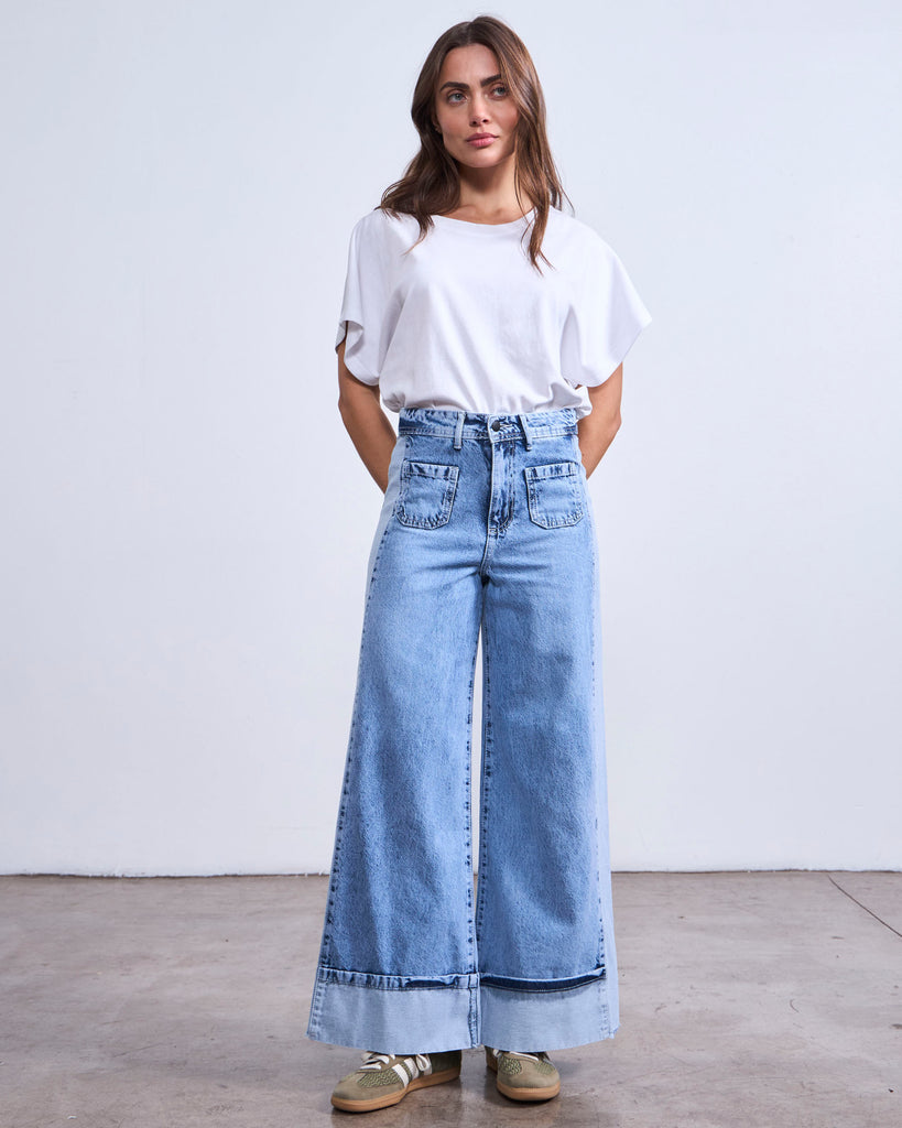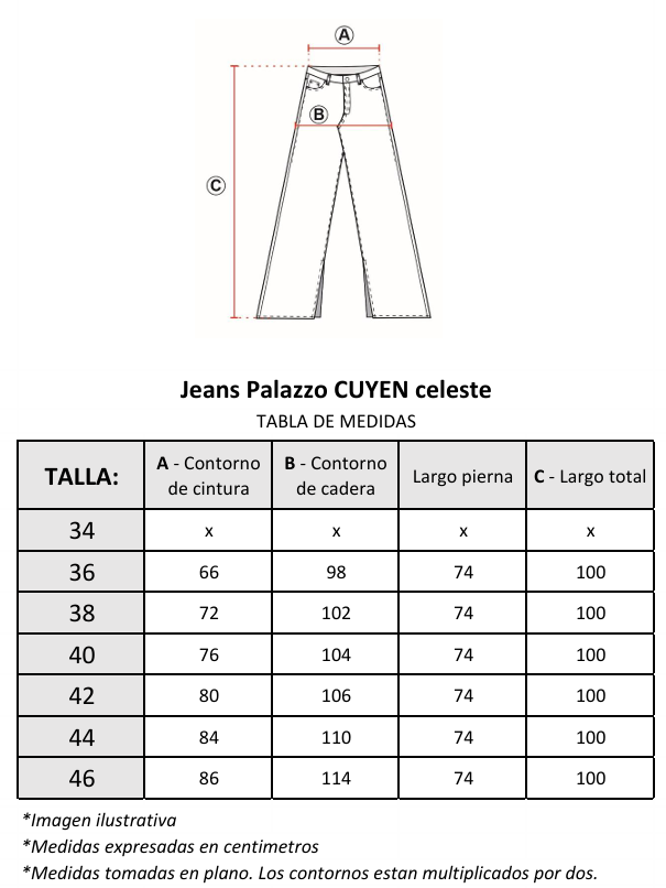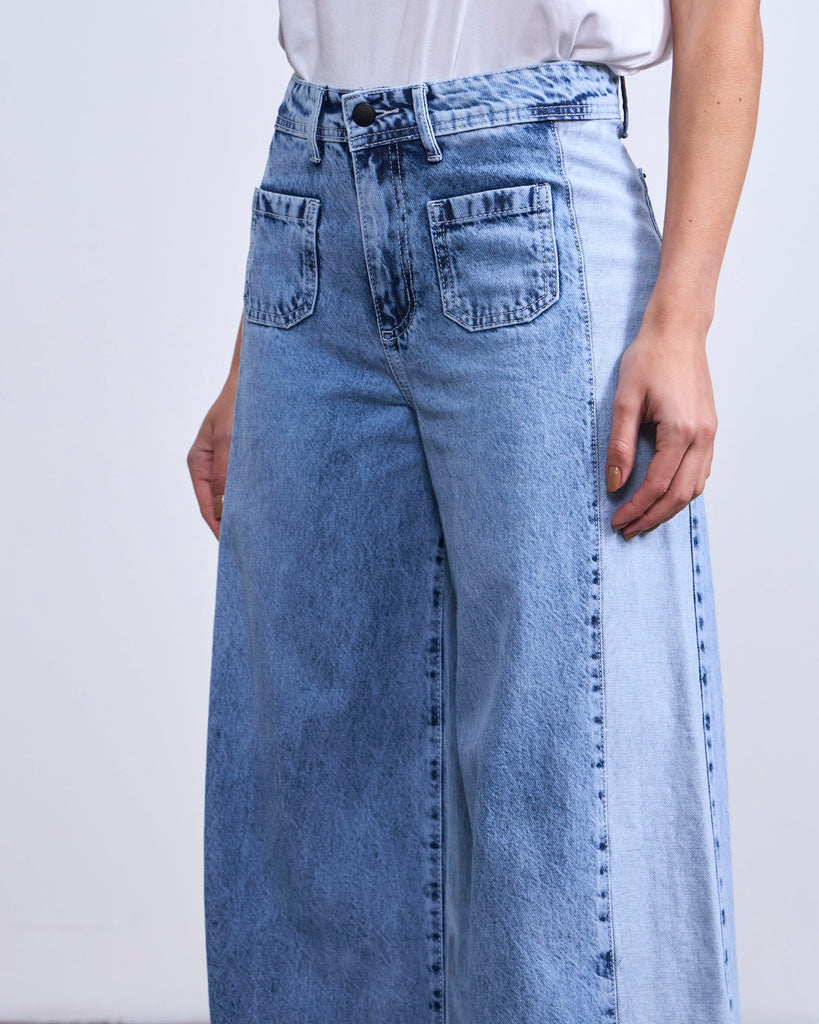 Jeans fit palazzo, tiro medio, y largo crop. Tiene una pieza de un tono mas claro en el costado.