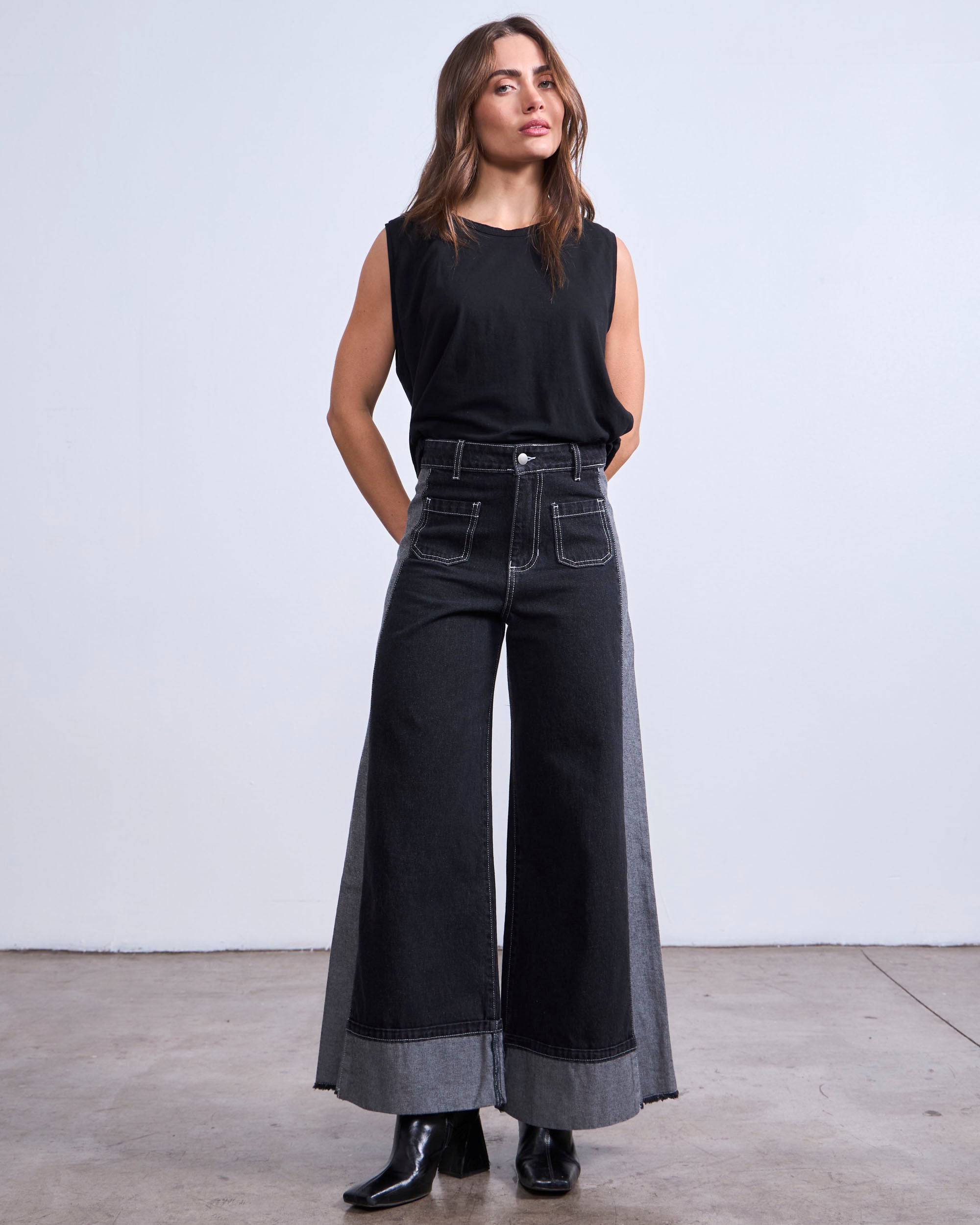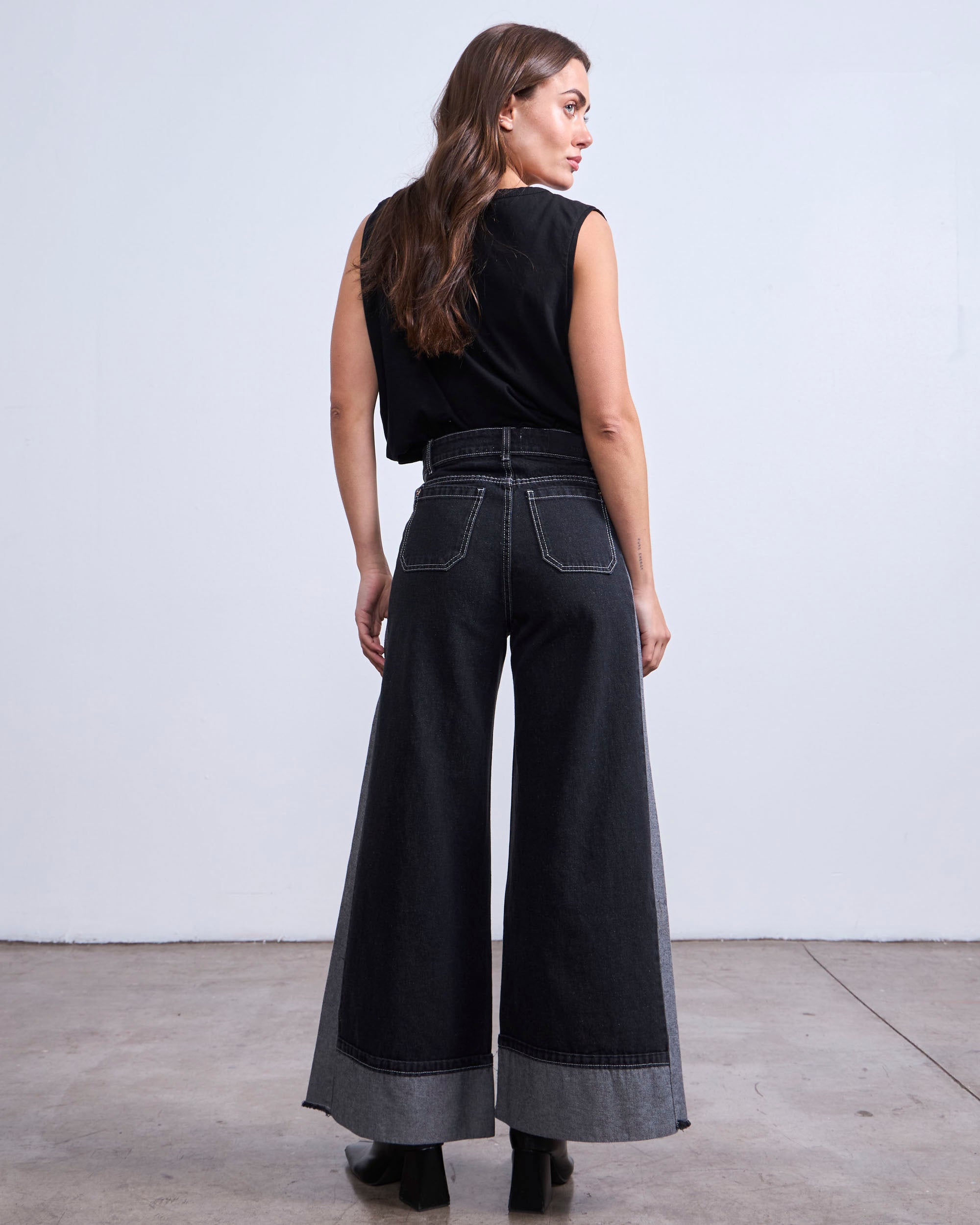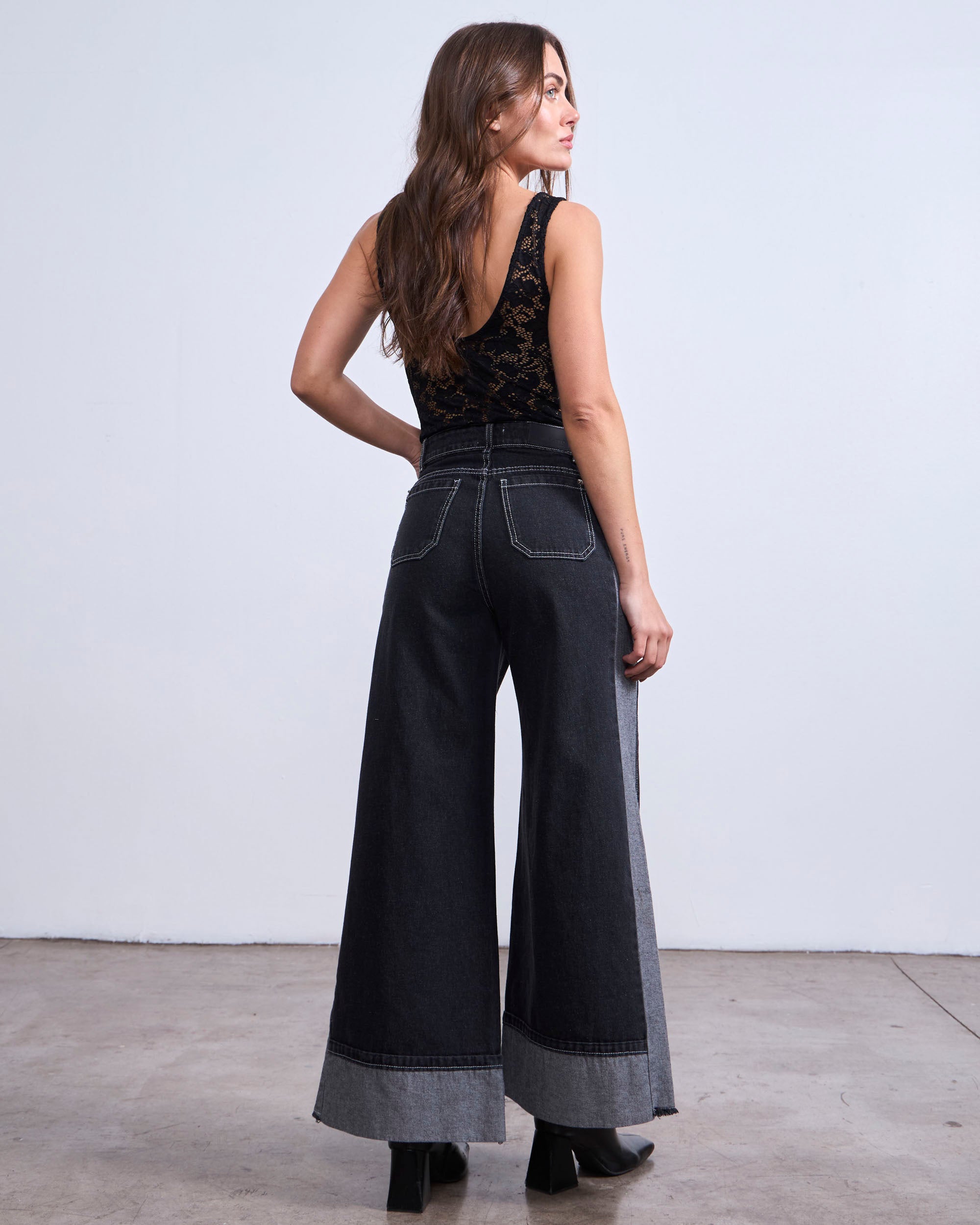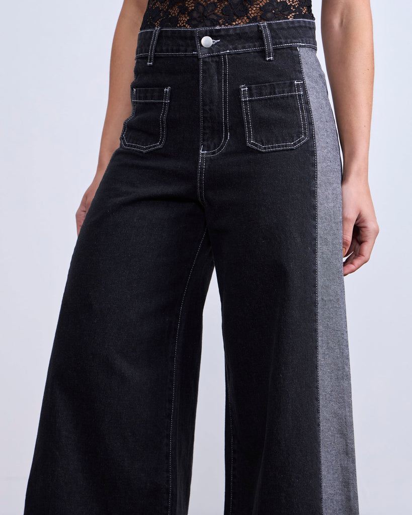 Jeans fit palazzo, tiro medio, y largo crop. Tiene una pieza del mismo color en el costado.