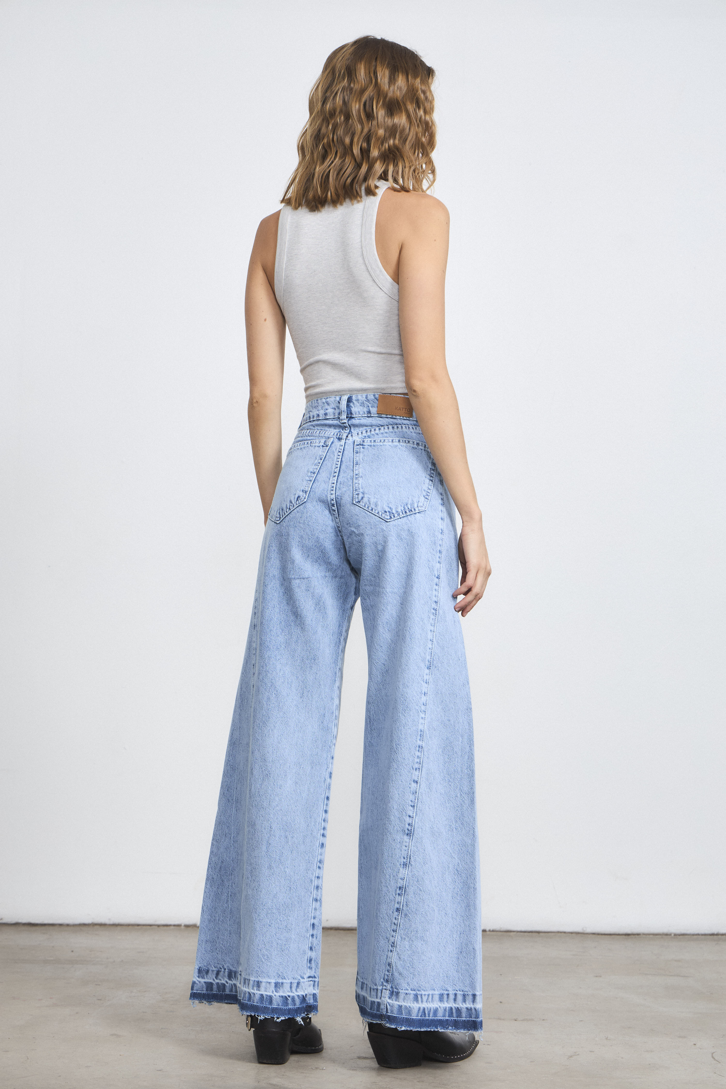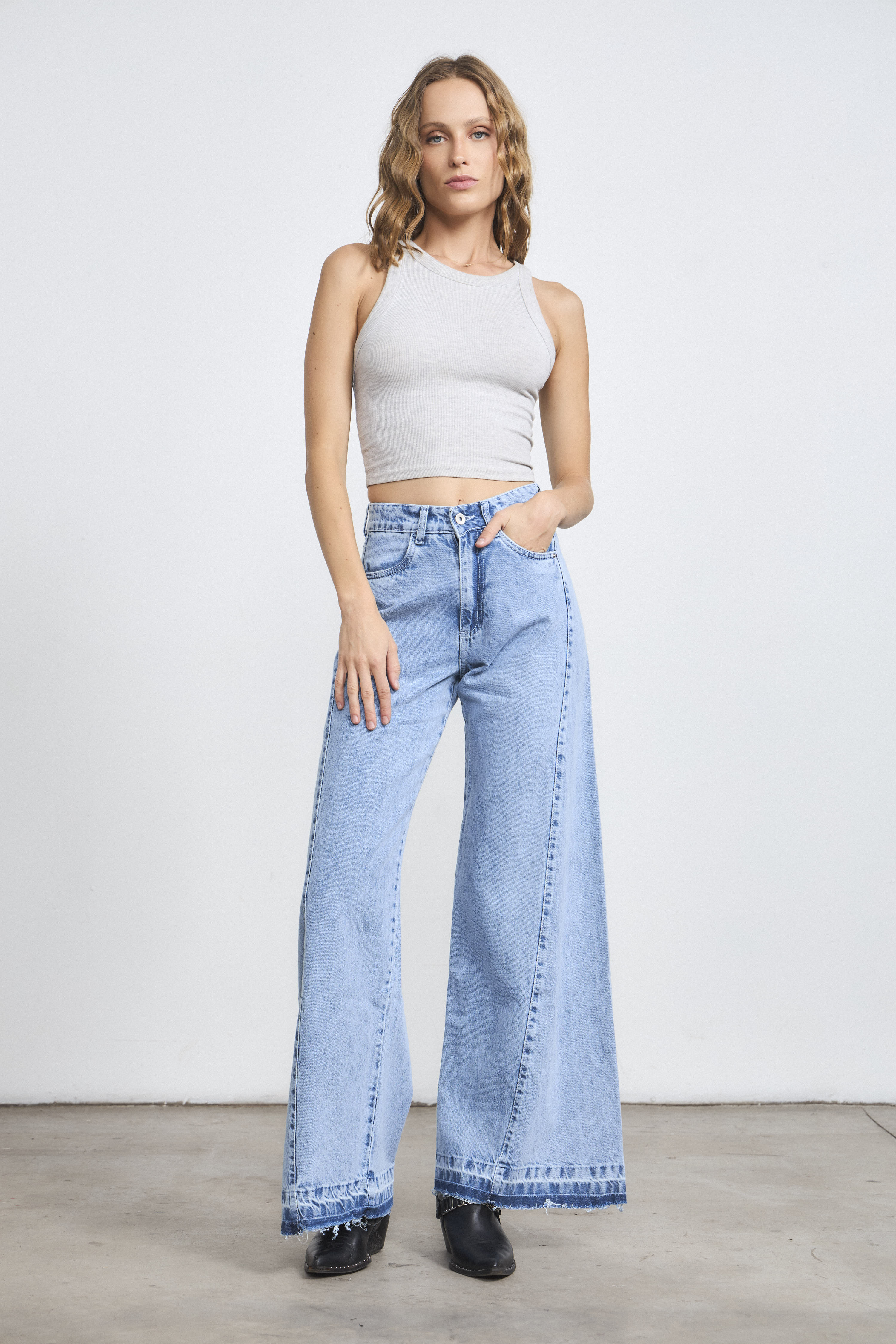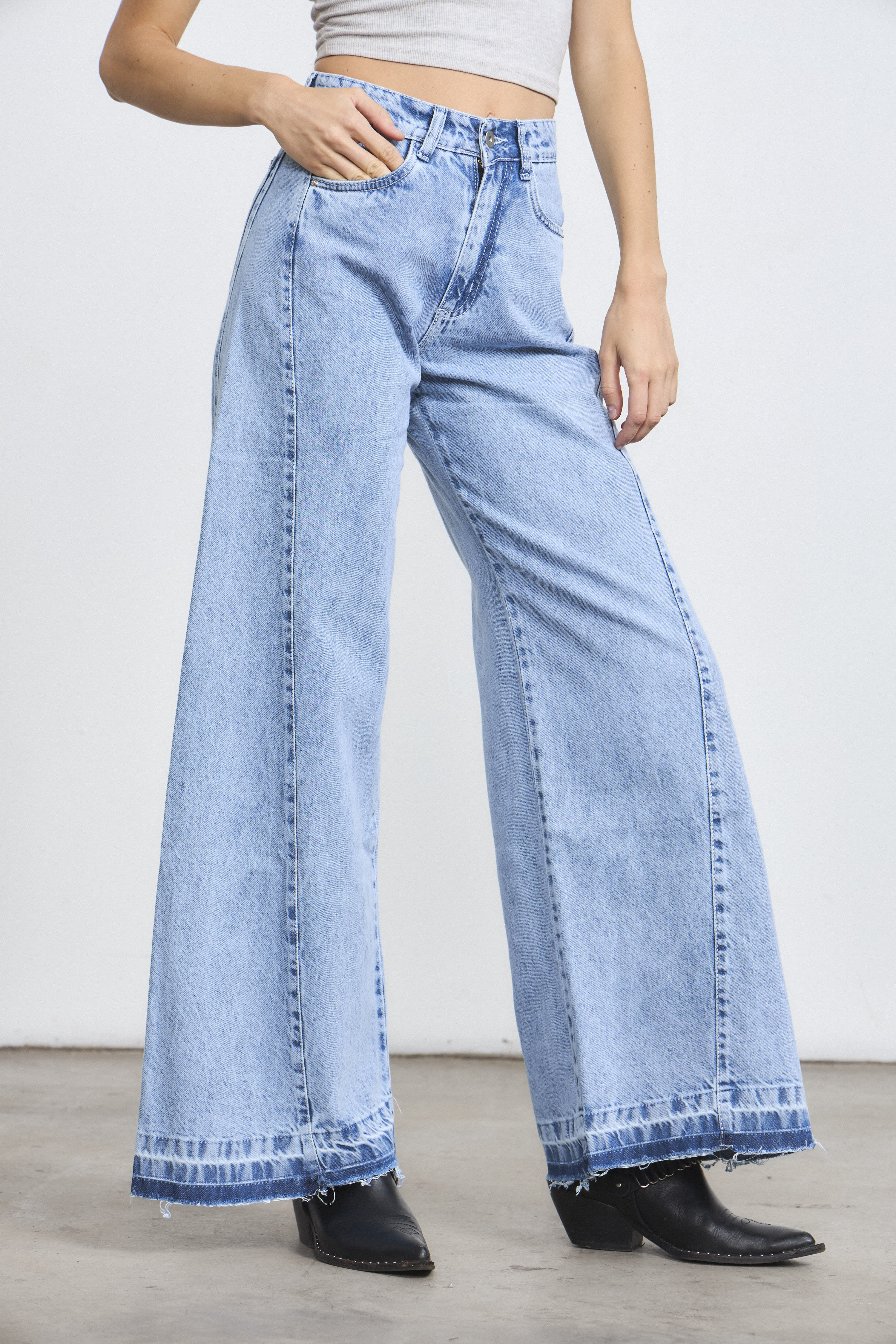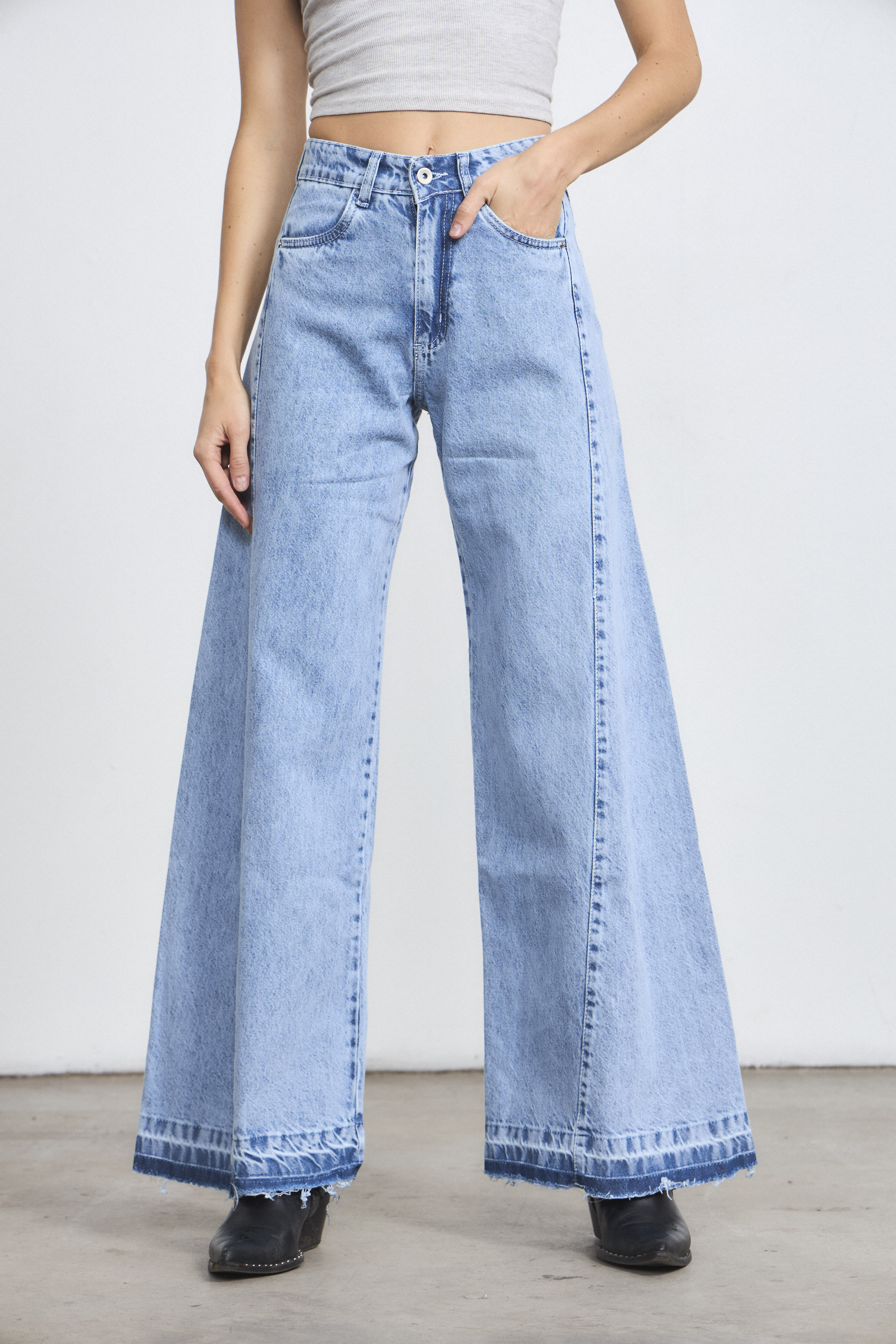 Jeans palazzo con fit ajustado en cadera y suelto en piernas. Cierre frontal con cremallera y botón metálico. Este jeans no tiene basta en el final de la pierna.